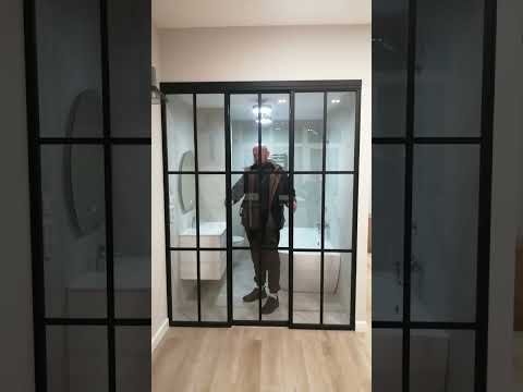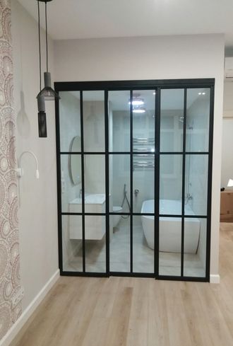 Подвесные двери, перегородка раздвижная Лофт, двери-купе стекло и черный профиль.